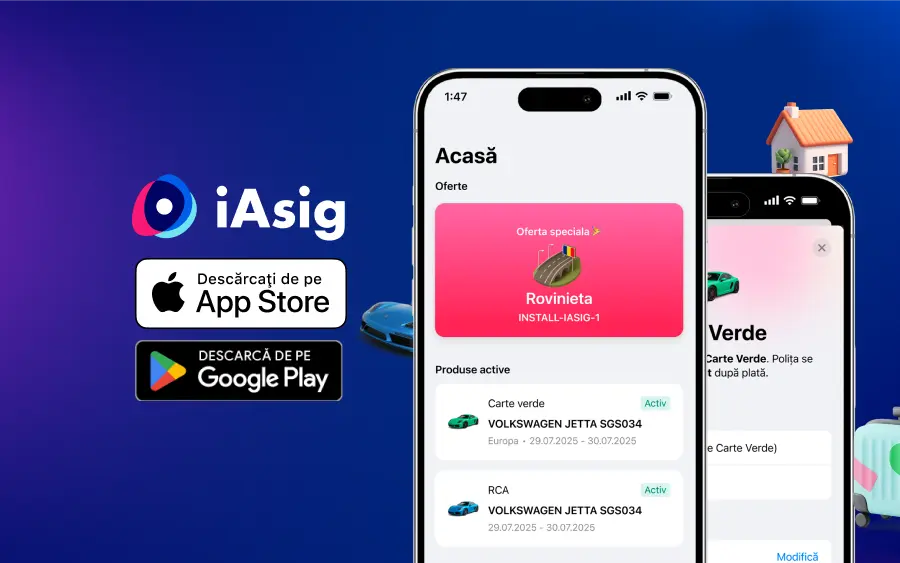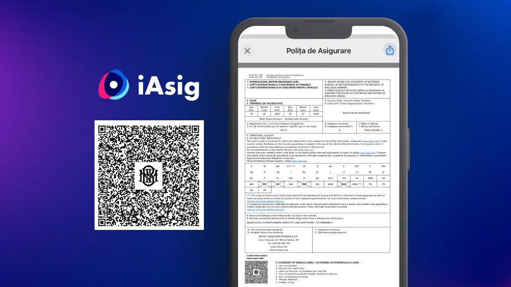 Produsele de asigurare sunt intermediate prin BAR IASIG INSURANCE S.R.L. (IDNO: 1024600043882), companie subsidiară care activează ca broker de asigurare-reasigurare licențiat. Prin utilizarea platformei, mandatezi gratuit subsidiarul, BAR IASIG INSURANCE, să te reprezinte în relația cu asigurătorii pentru obținerea ofertelor, încheierea, reperfectarea sau rezilierea contractelor de asigurare. Toate polițele sunt emise digital, având valoare legală deplină conform Legii nr. 284/2004.
